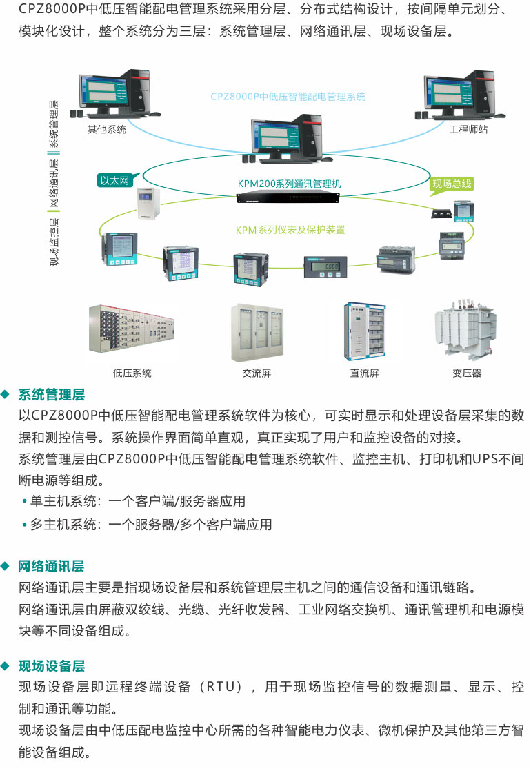CPZ8000P中低壓智能配電管理系統(tǒng)采用分層、分布式結(jié)構(gòu)設(shè)計(jì),按間隔單元?jiǎng)澐?、模塊化設(shè)計(jì),整個(gè)系統(tǒng)分為三層:系統(tǒng)管理層、網(wǎng)絡(luò)通訊層、現(xiàn)場設(shè)備層。