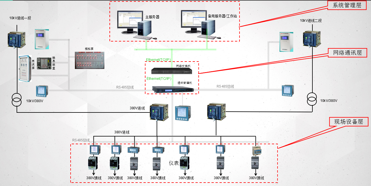 污水處理廠電能管理系統(tǒng)項(xiàng)目案例通過采用康派智能的電力儀表及電能管理系統(tǒng),對中低壓系統(tǒng)的設(shè)備進(jìn)行實(shí)時(shí)監(jiān)控及數(shù)據(jù)采集。數(shù)據(jù)采集主要包括模擬量以及開關(guān)量的采集。模擬量的采集主要是對線路電壓、電流、功率、功率因數(shù)、頻率等信息進(jìn)行采集,開關(guān)量的采集則主要是對斷路器的工作狀態(tài),以及斷電保護(hù)、運(yùn)行故障等報(bào)警信息進(jìn)行采集,實(shí)現(xiàn)遠(yuǎn)程數(shù)據(jù)的本地實(shí)時(shí)顯示。