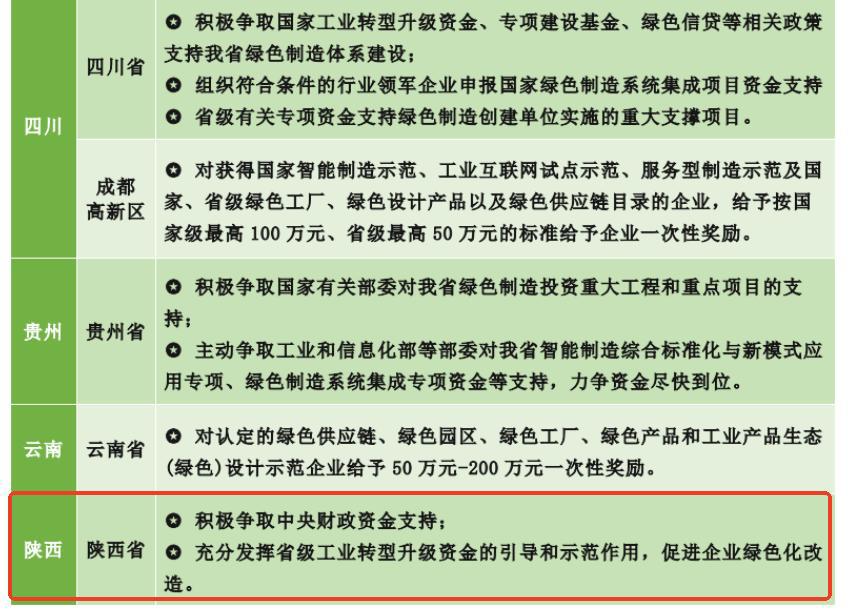 為貫徹落實《“十四五”工業(yè)綠色發(fā)展規(guī)劃》《工業(yè)領域碳達峰實施方案》,各省份積極響應并分別發(fā)布了依據(jù)本地區(qū)特點制定的相關政策,為激勵工業(yè)企業(yè)積極進行綠色工廠、綠色設計產品、綠色園區(qū)創(chuàng)建和申報,大部分地區(qū)政府對于入選國家級綠色園區(qū)、工廠名單的企業(yè)給予一次性獎勵100萬元,部分城市的獎勵金額更是達到了1000萬元。關于綠色工廠,不同的省市都有不同的鼓勵性政策補貼,下圖是山西省份的政策補貼: