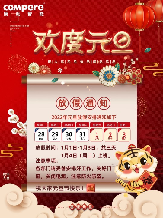 公司定于 2022年 1 月 1日至 1 月 3 日放假調(diào)休,共3天,1月4日(周二)上班。