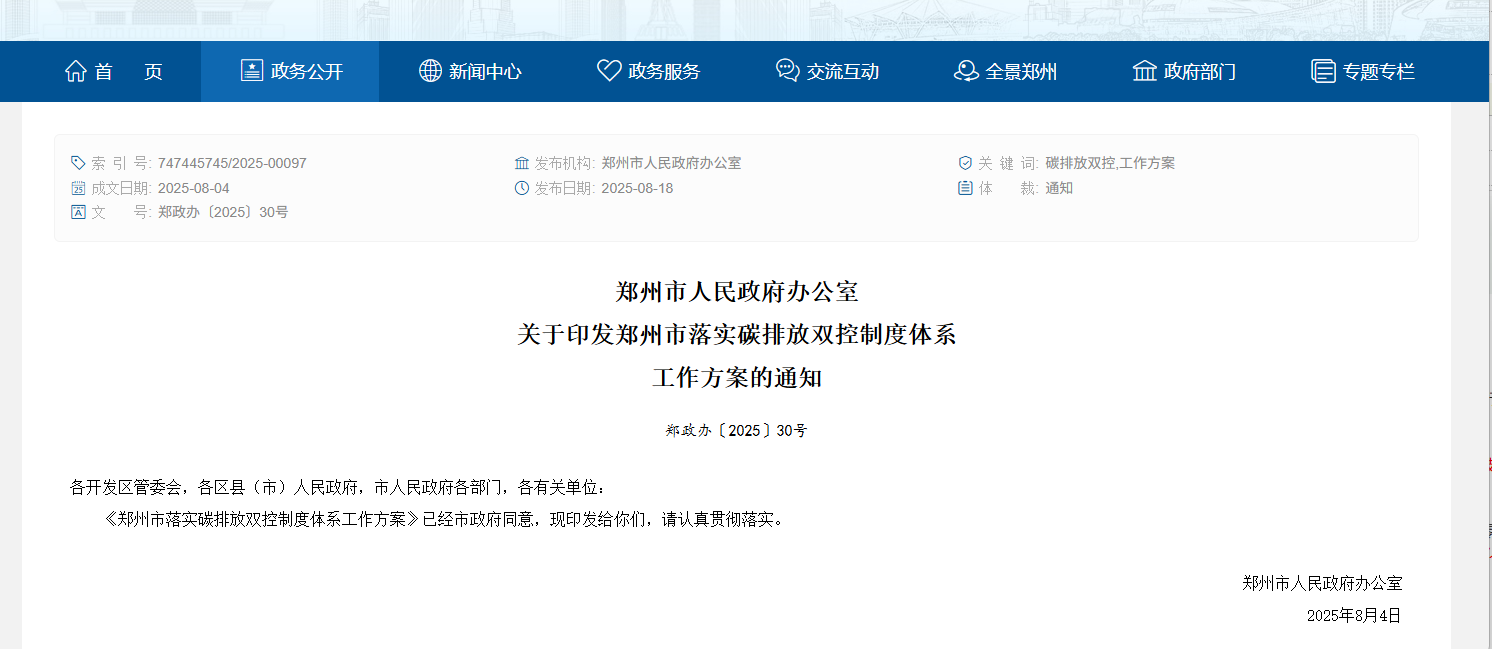 近日,鄭州市人民政府辦公室印發(fā)鄭州市落實(shí)碳排放雙控制度體系工作方案的通知。