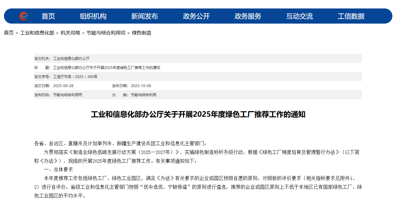工業(yè)和信息化部辦公廳關(guān)于開(kāi)展2025年度綠色工廠推薦工作的通知
