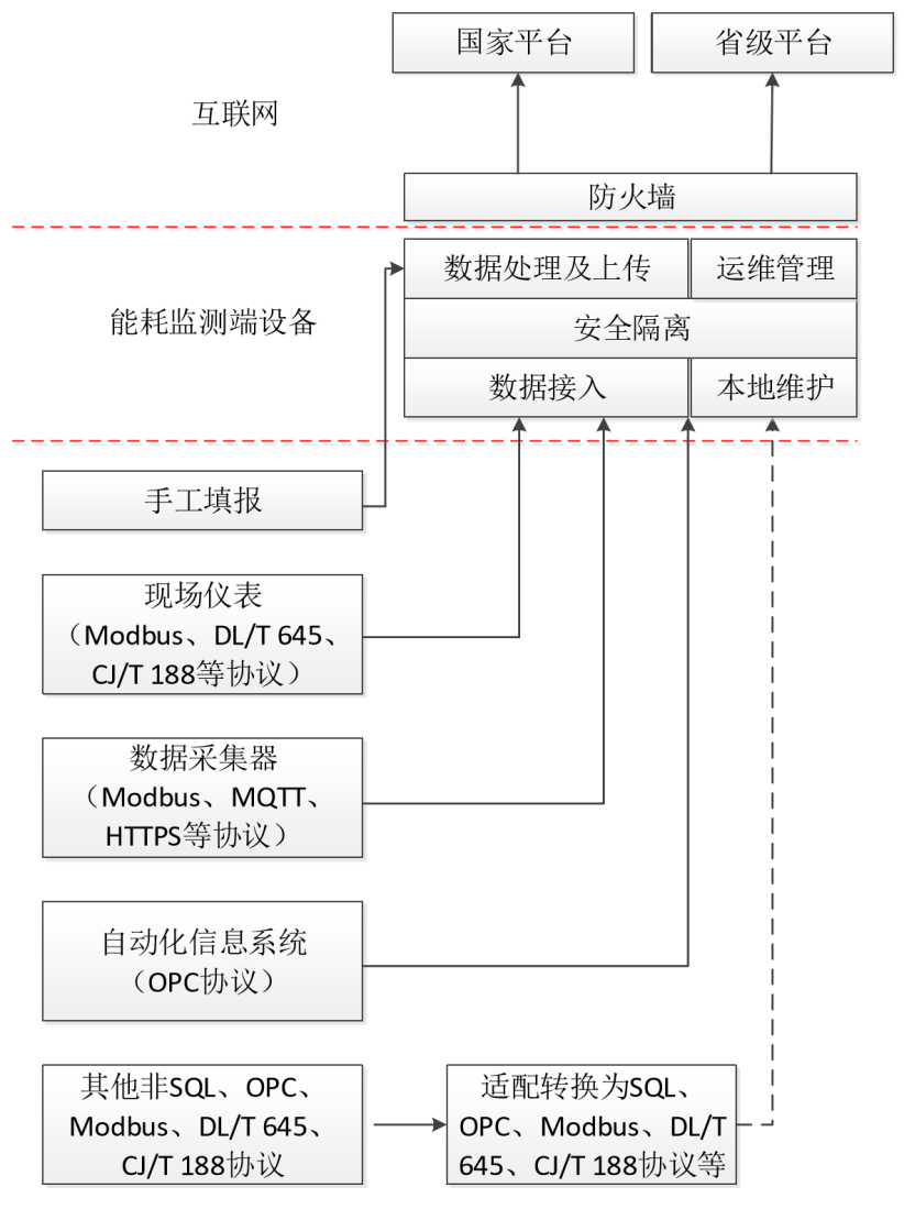 端設(shè)備支持SQL、OPC、MODBUS、DL/T 645、CJ/T188協(xié)議,能耗在線監(jiān)測(cè)端設(shè)備對(duì)采集到的數(shù)據(jù)進(jìn)行匯總,驗(yàn)證、篩選、整理打包后,采用“CA認(rèn)證+HTTPS協(xié)議+VPN專線”方式多重加密將數(shù)據(jù)傳輸至省級(jí)平臺(tái)。