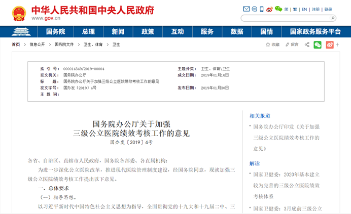 3、2019年1月29日《關(guān)于加強(qiáng)三級(jí)公立醫(yī)院績(jī)效考核工作的意見》