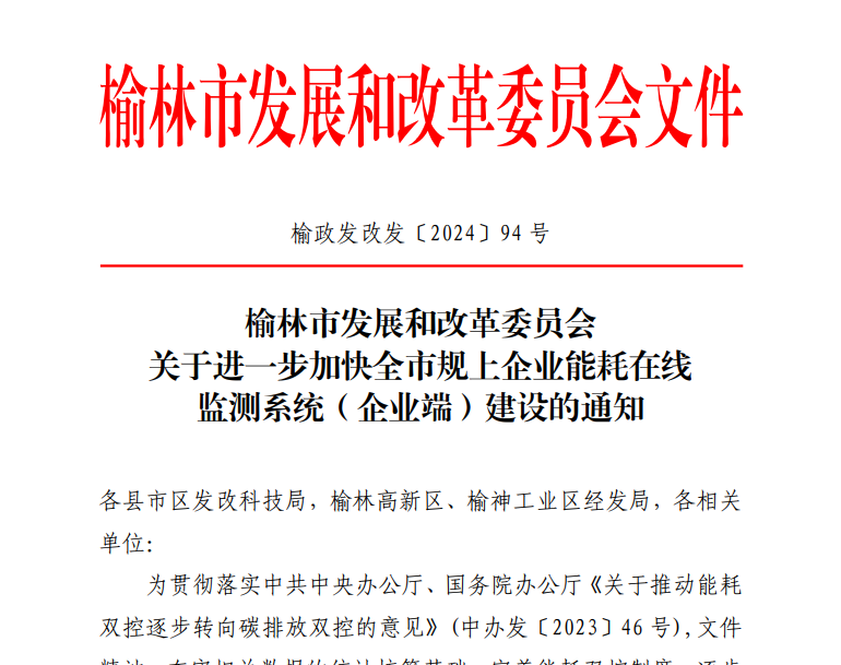 根據(jù)榆林市發(fā)展和改革委員會(huì)下發(fā)的文件通知,為加快推進(jìn)榆林市重點(diǎn)用能單位能耗在線監(jiān)測(cè)系統(tǒng)平臺(tái)建設(shè),要求榆林市各企業(yè)年消耗 1000 噸標(biāo)準(zhǔn)煤以上或消耗電力 500 萬(wàn)千瓦時(shí)以上的新建項(xiàng)目,在入統(tǒng)前均要接入市平臺(tái),實(shí)現(xiàn)一級(jí)計(jì)量能源消耗和外供數(shù)據(jù)的實(shí)時(shí)采集。